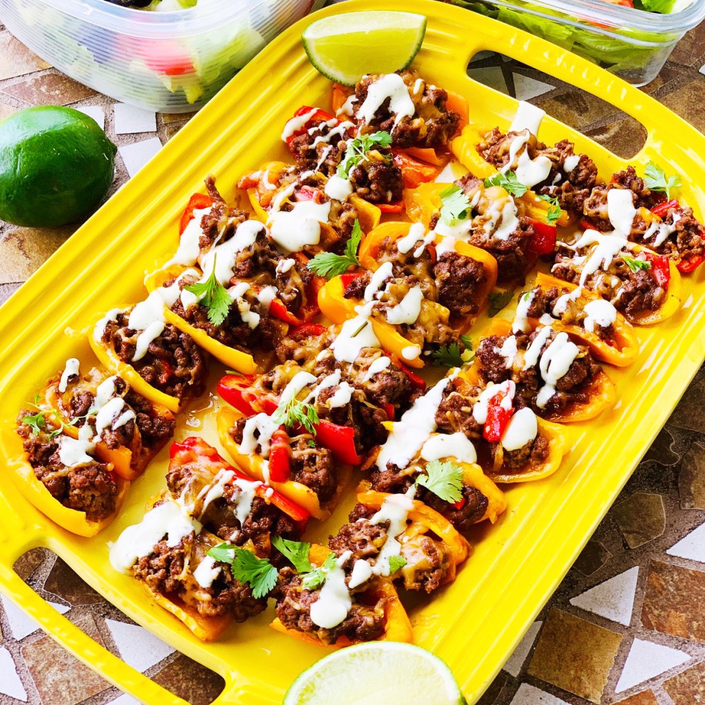 I am pretty sure we all love Taco Tuesday, so why not try something new as the base? These mini taco bell pepper boats are colorful, crunchy and you could pop them in your mouth. Serve on top of a salad, with a side of yellow rice and beans and your fave tortilla chips, I love Siete brand. Start by cooking your favorite taco meat: I like to use ground turkey seasoned with salt, pepper, fresh garlic, chopped yellow onions and taco seasoning, from Trader Joes. Slice your peppers in half and spoon out the seeds. Stuff your taco meat inside each half and top with a Mexican cheese blend. Pop them in the oven on 350 for 20 minutes. Top with sour cream, guacamole, cilantro, lime and hot sauce and DIG IN.