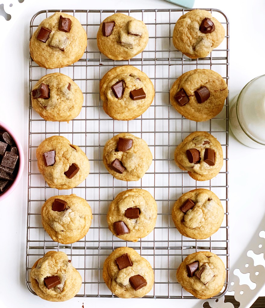 Let’s be truthful, everything is way cuter (and delicious) when made mini, especially baked goods. Baking mini also helps with portion control. Make your favorite chocolate chip cookie recipe, mine is Cooking Classy’s, linked here. Make teaspoon sized balls when forming your cookies, it’s going to make about double the amount. Then, freeze half of them, enjoy a few now and save some for another day 🙂