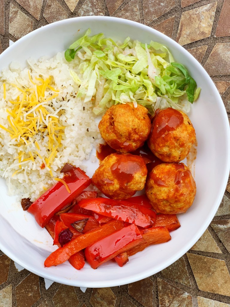 Okay, wow. I had the craving for some meatballs but wanted to think out of the box. I asked Mark what he was feeling and he said, taco night?! So there came these chicken taco meatballs. I served them in a bowl with cheesy cauliflower rice, sauteed peppers and onions and lettuce. Ingredients are sparse right now, but when I make these again I would add guac, salsa, sour cream and cilantro. So, if you have those toppings, please try them and report back! Now lets get into the recipe.