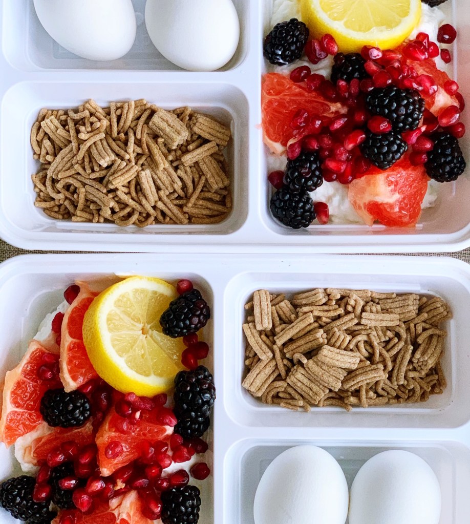 Sometimes I crave more of a brunch styled lunch, so I make fruity yogurt bowls. This one has Greek yogurt, grapefruit, black raspberries, pomegranate seeds, lemon and honey. I like to pair these with a side of fiber cereal ( this is the high fiber cereal from Trader Joe’s), but any kind you like will do! Then, for some extra protein, I add in two boiled eggs. This is such a refreshing “brunch” and is packed with nutrients.