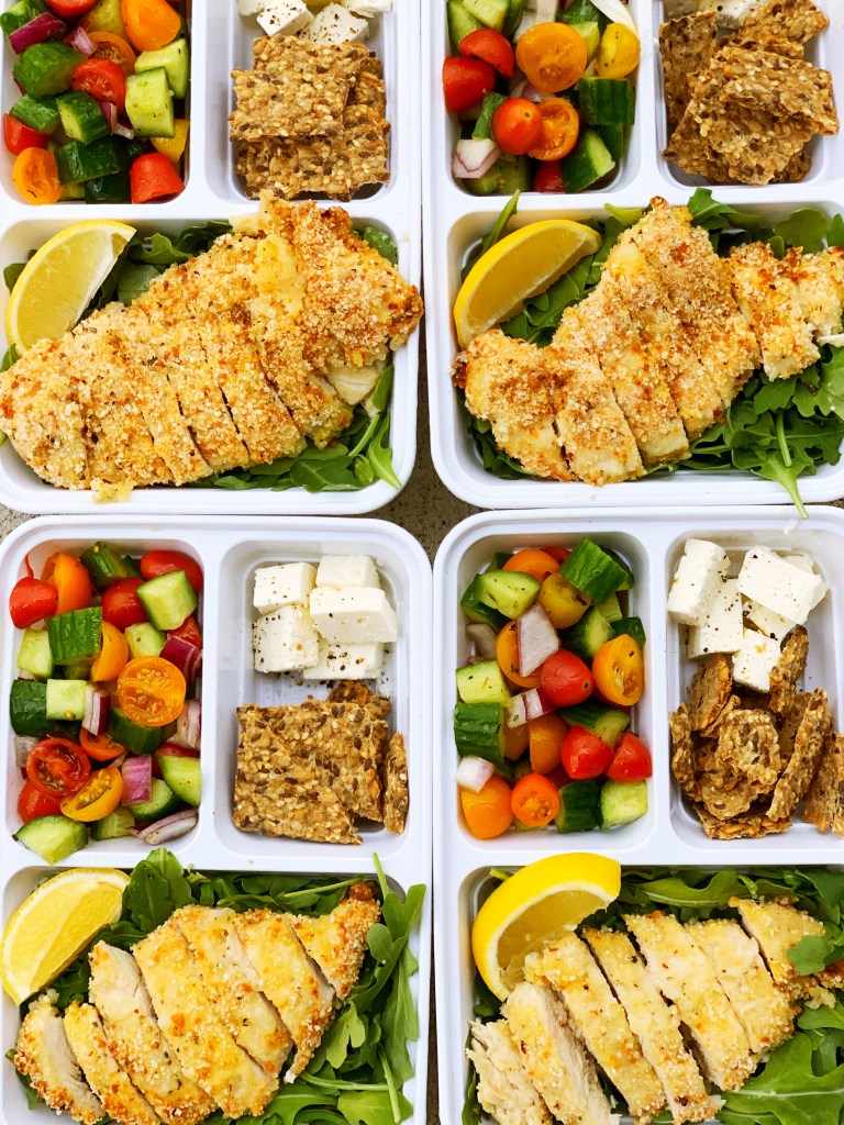 I took four chicken breasts and dipped them into flour, egg wash and then 1 cup of panko, 1/2 cup of parm cheese, salt and pepper. Baked on 350 for 25 minutes and broiled on hi for 2 minutes (use a meat thermometer to make sure cooked). Then, I placed the chicken over a bed of arugula with a side of cucumbers, tomatoes, onions, olive oil and salt and pepper. On the left I added gluten-free crisp bread crackers from Trader Joe’s and some feta cheese. I used Italian dressing & a squeeze of lemon to top this lunch off!