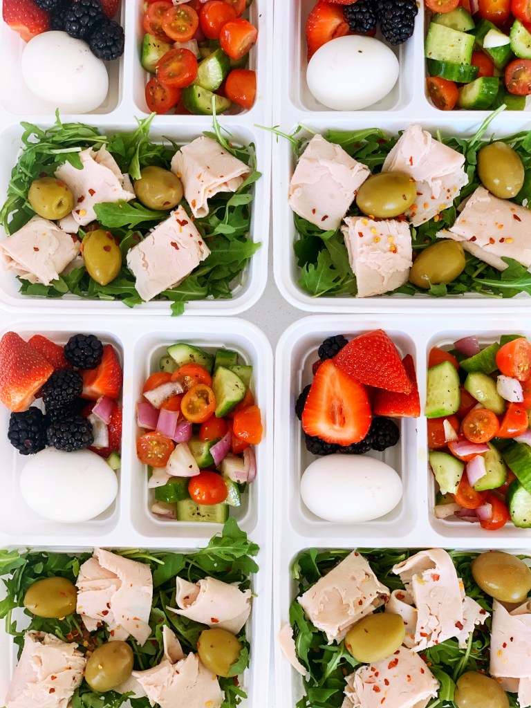 Whether you’re an essential worker and need to still bring your meals to work or if you would rather prep on the weekend and not worry about your meals throughout the week, this post is for you. I don’t know about you, but sometimes a snack styled lunch is way more fun to eat. My favorite white bento boxes have three different sections for me to play around with. I usually use the big space for a salad or veggie base, then one of the smaller compartments for the protein and the other for salad toppings or a crunch! I am sharing six of my favorite meal preps. The best part is that most of these involve little to no cooking and are so easy and fast to prep for the week ahead. Let me know which ones you try and tag me on instagram so I can see them. Happy meal prepping!