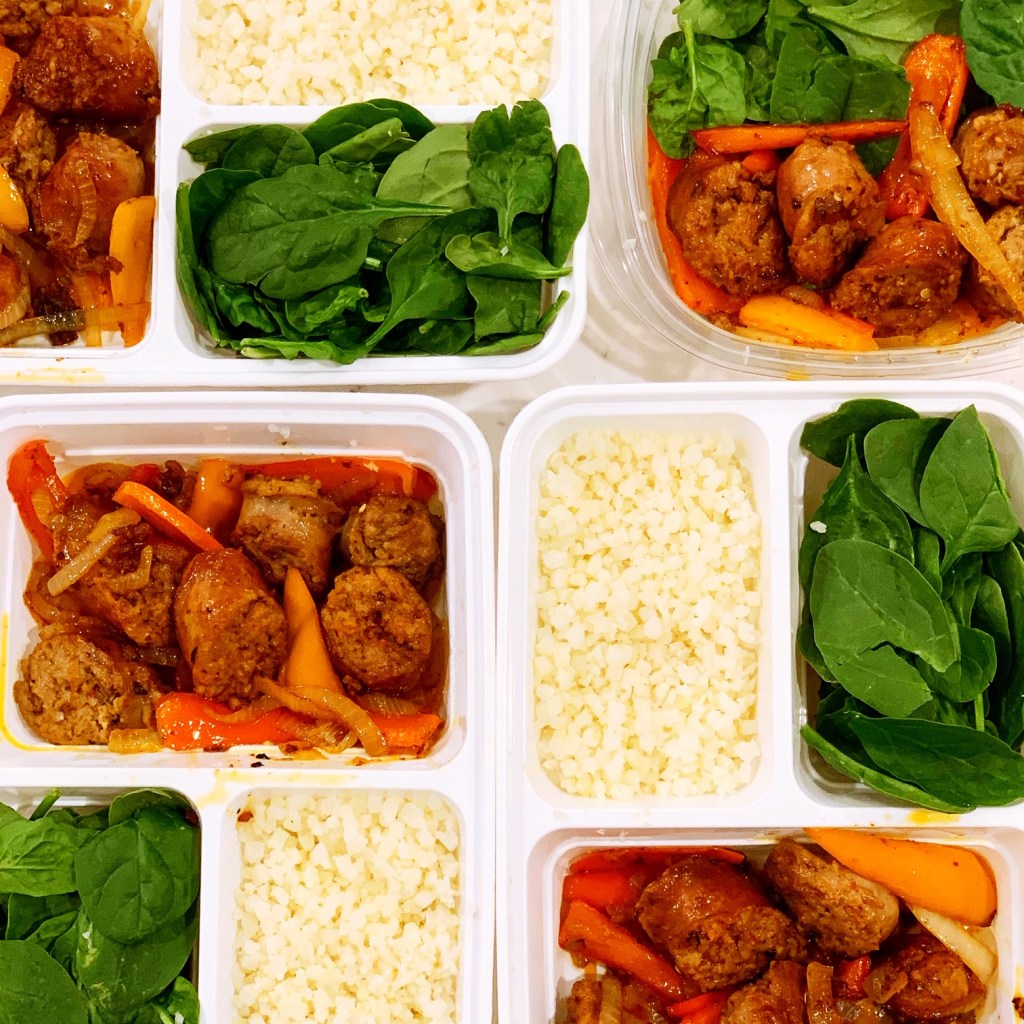 Phew, not arugula in this one! Changing it up with a hot meal prep. This one has a base of frozen cauliflower rice ( I put it in frozen). Then I sauté spicy Italian sausage with peppers and onions and serve with a side of spinach. When you warm this one up, mix everything together for a comforting lunch, it actually tastes better as leftovers!
