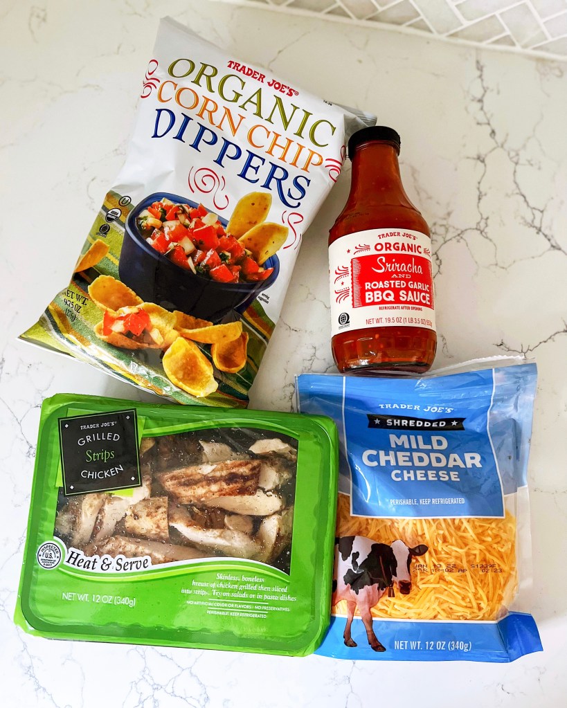 Nachos…need I say more? We looooove ourselves some nachos so Mark is going to really love this one! I think we will be having this one today. I got the corn chip dippers as the base and then I am going to add the garlic sriracha bbq sauce (THIS IS SO GOOD, my new fave product, I have been using it on everything and anything) onto the grilled chicken and cheddar cheese. Bake on 350 for about 10 minutes until the cheese is all melty and add some scallions on top!