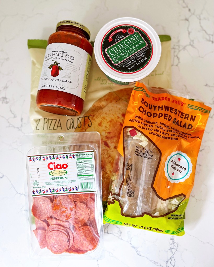 For this one I picked up pizza crusts, I have never tried them yet but I am excited, they come in a pack of two! I then will add their Rustico Sauce, fresh mozzarella cheese and pepperoni and will serve with this Southwestern chopped salad. Sounds yummy and like our Friday night meal!