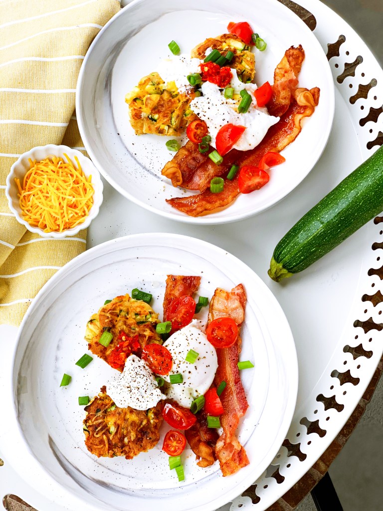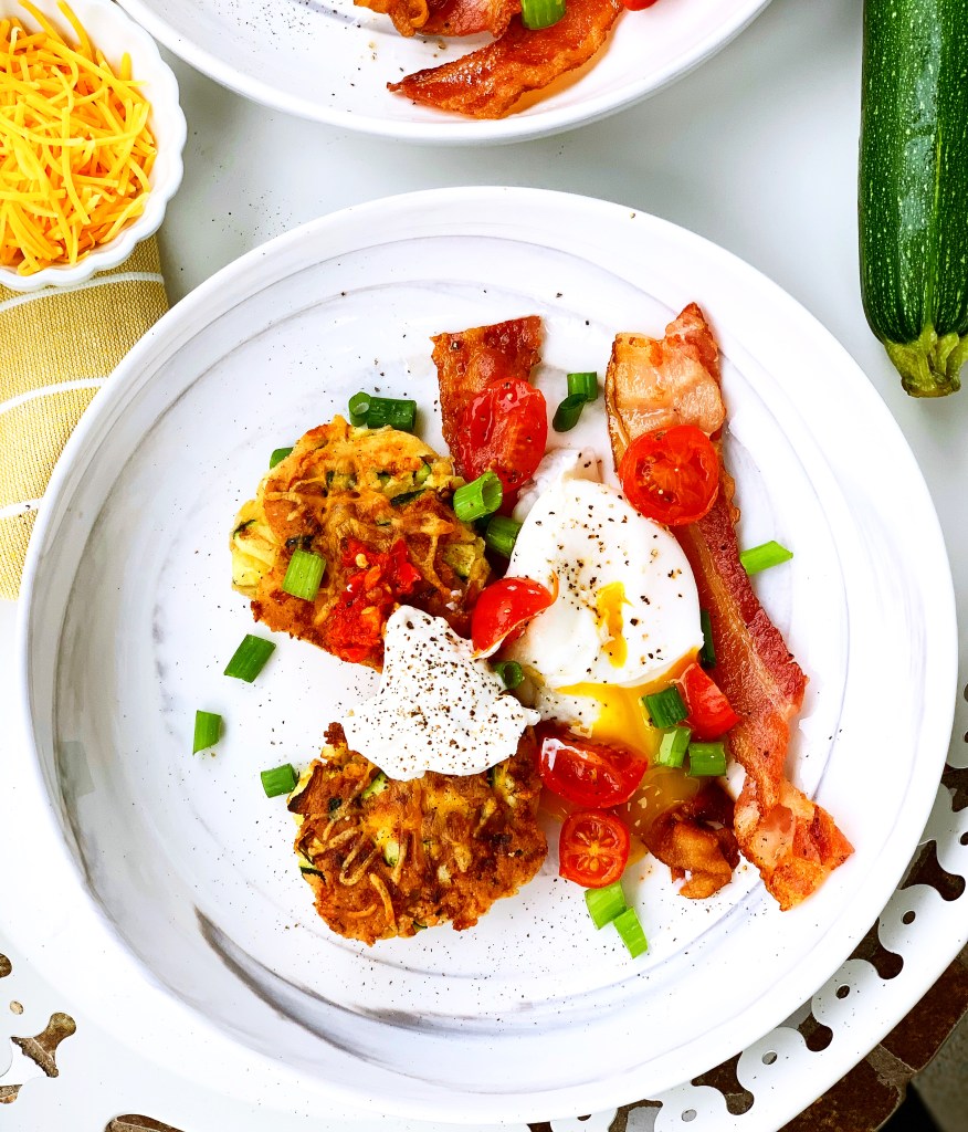 Last night I did an instagram poll in my stories, asking if you wanted to see a SAVORY or SWEET Saturday brunch idea, savory won, 64% to 36% ( I like savory more too, truth be told I would eat Chinese food or pizza for brunch also, savory is more satisfying to me at that 10am-11am time frame) So, I had a few zucchinis in my veggie drawer just waiting to be used. I do not have a spiralizer (it is on my registry if anyone wants to get me it…just kidding) so I chopped up the zucchini nice and small and used paper towels to get some of the moisture out…yeah I probably need a cloth to do that too…*add to amazon cart. Mark wanted bacon, surprise surprise, so I paired these CRISPY CHEDDAR ZUCCHINI FRITTERS with a poached egg, bacon, fresh tomatoes, chives, a spoonful of sour cream and Italian hot pepper bomba sauce (from Trader Joes, my fave) and salt and pepper. It was delicious, nutritious and super satisfying this morning (oh and it is GLUTEN-FREE) Enjoy!