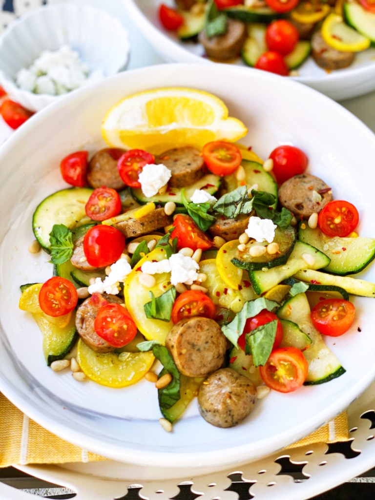 Long time no see! I told myself I would write one recipe blog post a week, well that got hard! I never realized just how hard it is to make up your own recipe, with pinterest-you search anything and there is something for it. So I kinda stopped looking at pinterest when I was creating meals and hoped that mine were somehow different. It was HOT in NJ yesterday and I was craving something light with veggies. I made this warm summer squash bowl, by slicing the squashes up nice and thin and cutting them in half. Then, I sauteed them in olive oil with the chicken sausages (these are from Trader Joes and are the sun dried tomato ones, soooo good). I topped this bowl off with grape tomatoes, fresh basil, goat cheese, pine nuts and a squeeze of fresh lemon. It is light, flavorful, low carb and a delicious summer meal! Oh and this took me 12 minutes to make…