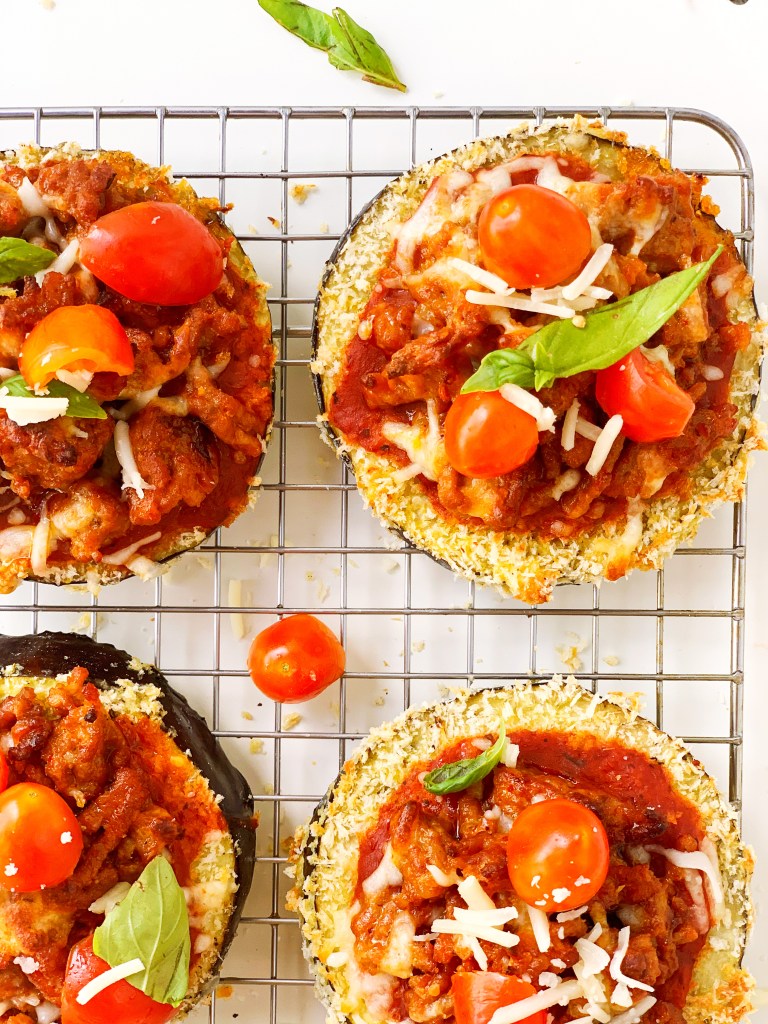 Hi guys! I wanted to share last night’s dinner that I randomly created and wow it was GOOD. I have had an eggplant sitting in my veggie drawer for a bit and was going to make eggplant meatballs, but those will have to wait until next week! I was craving something like pizza, so here became these delicious sausage eggplant pizzas! These were SIMPLE, CRISPY and oh so SATISFYING. They are baked and made with panko, topped with pizza sauce, sausage and mozzarella cheese and finally fresh tomatoes and basil from my patio (ps, I cannot believe I am still keeping it alive, yay!) This is something the kids may even like! Switch up the sausage for chicken or turkey meat, pepperoni or really anything! Use the panko crusted baked eggplant as a base and go crazy with the toppings you like! Let me know what you decide to top your pizzas with! Enjoy!